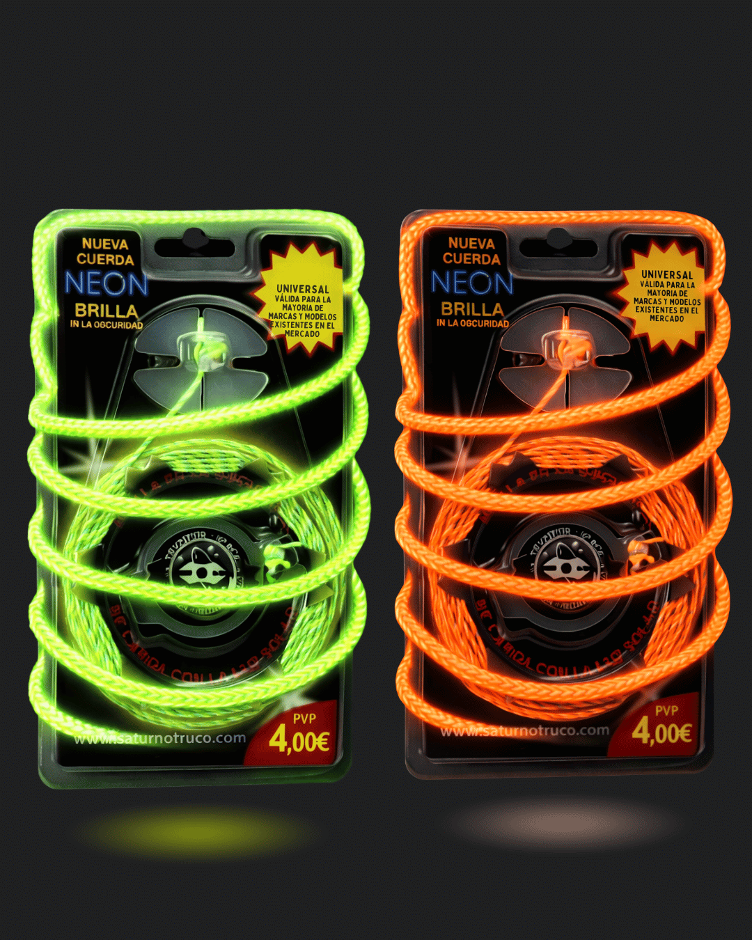 Las cuerdas luminiscentes de Trompos Space son la última novedad que se puede encontrar en el mercado. Se trata de cuerdas realizadas con material flúor que brillan en la oscuridad y producen destellos impresionantes mientras se juega al trompo.
